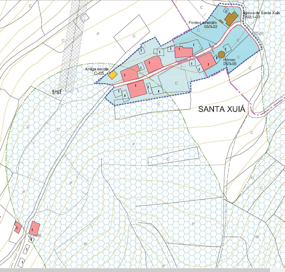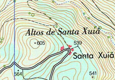 Accesos: Sairemos pola LU-530 cara a Lugo e no Kilómetro 55,200 colleremos a esquerda a estrada CP 1901 dirección Navia de Suarna. A uns 4,5 Km atoparemos un cruce polo que collemos a esquerda e a uns 3,4 Km. estaremos en santa Xuía